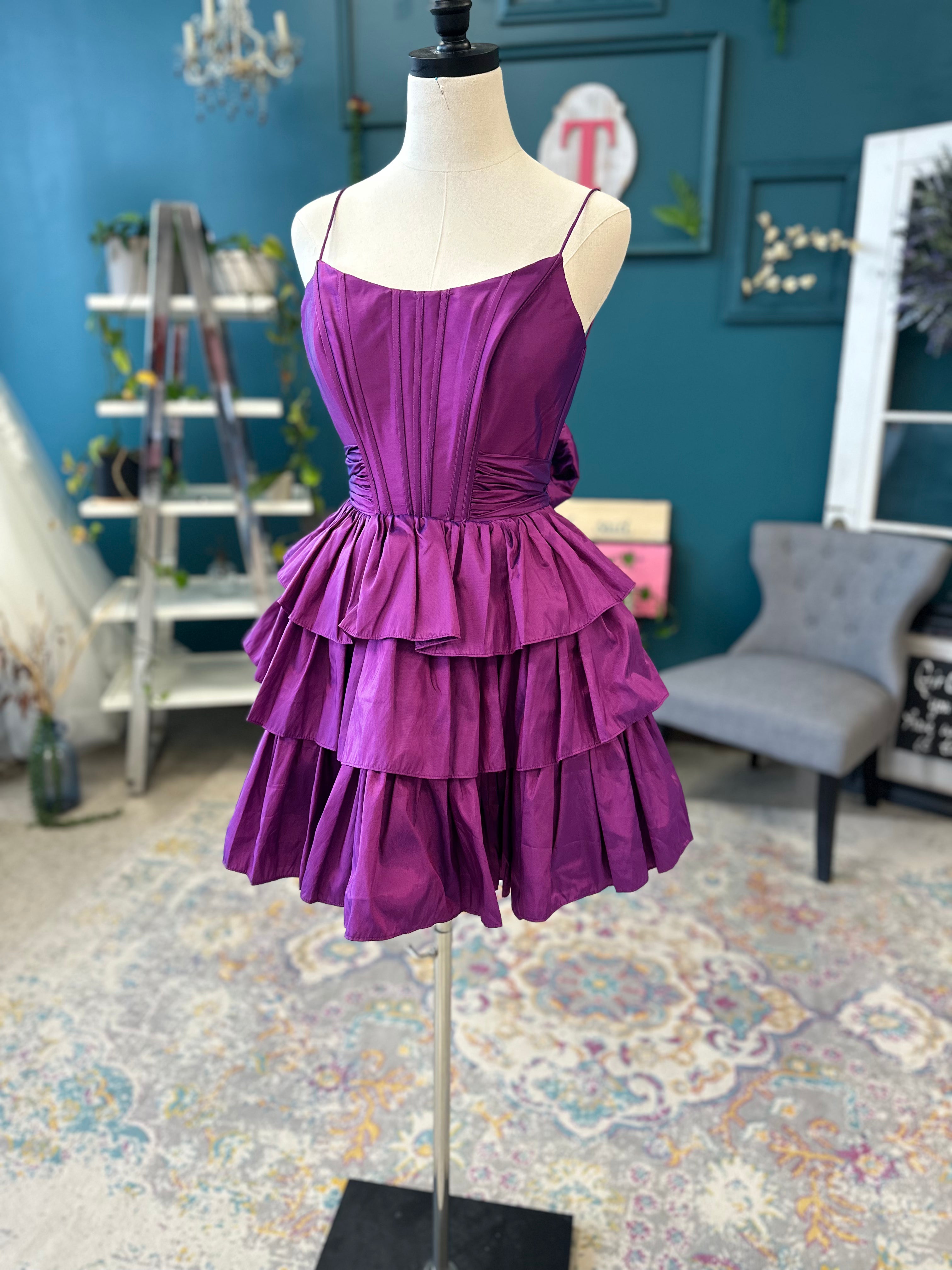 Rachel Allan Ultraviolet homecoming dress in a stretch satin. Tiered skirt, structured bodice, spaghetti straps and wide belt to cinch your waist.