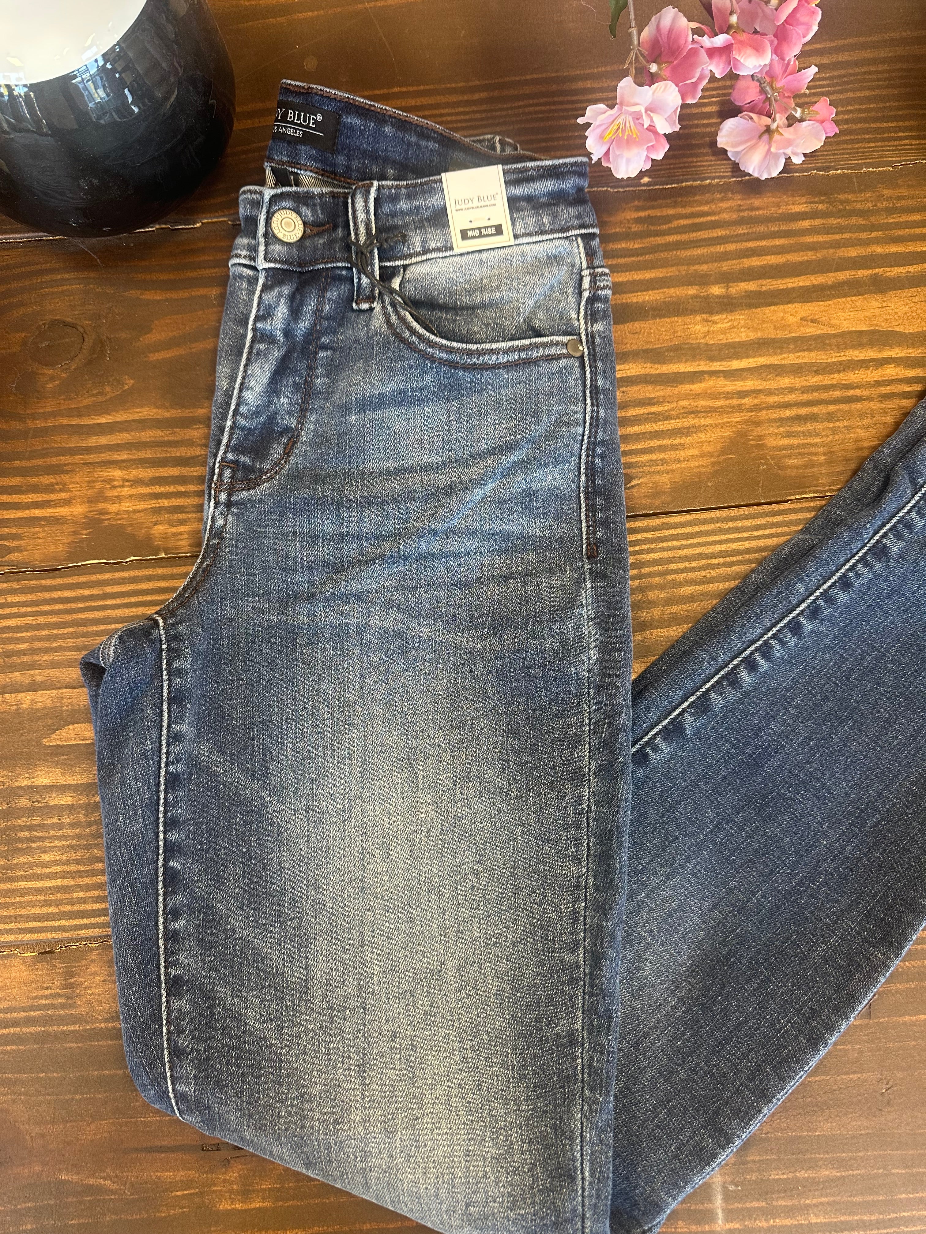 Judy Blue Slim cut jeans with a mid rise and dark wash.  No distressing making them perfect for work.