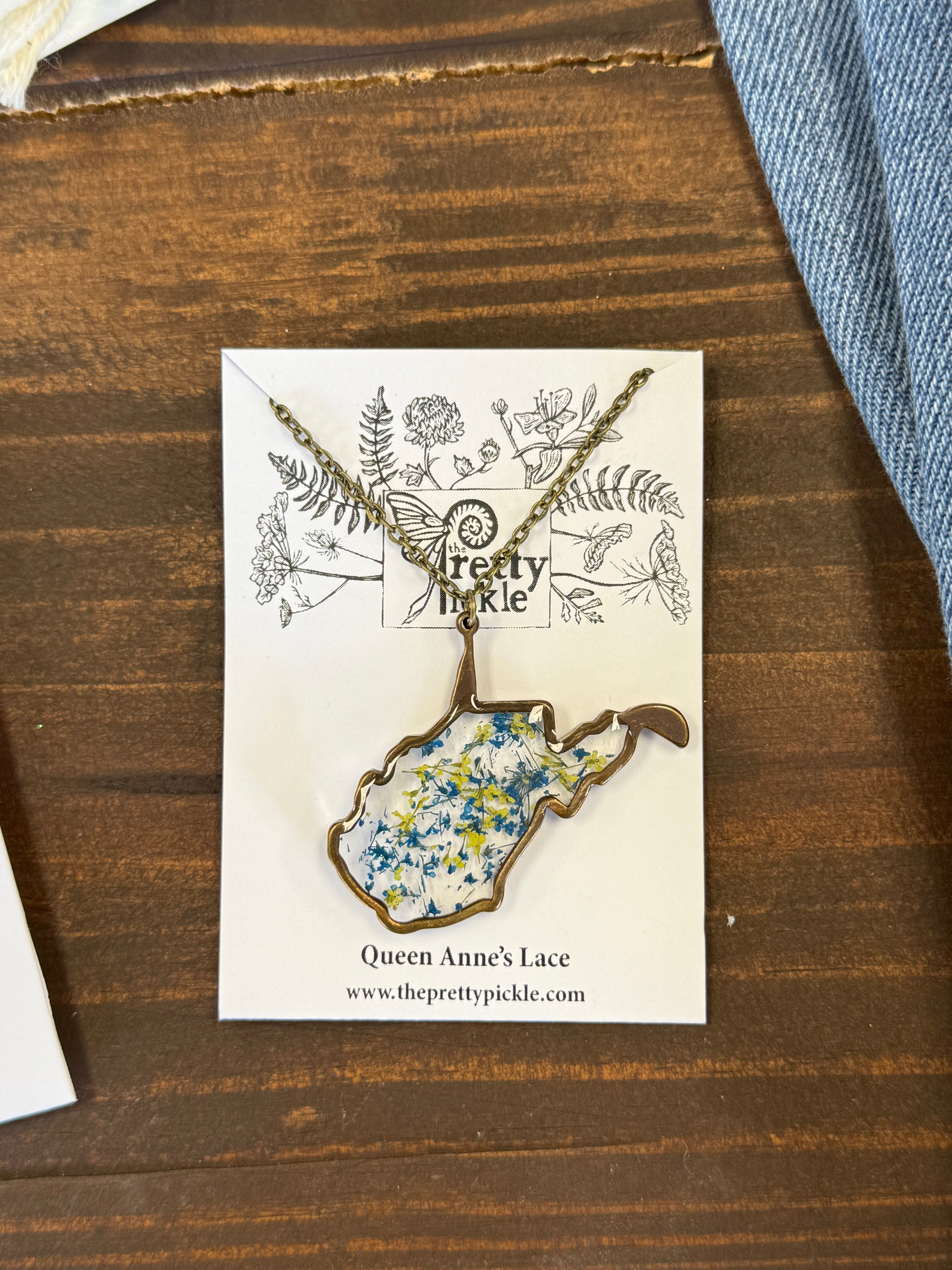 This beautiful necklace is a statement piece showing your WV pride! The antique bronze design is filled with Queen Anne's lace and will be the perfect addition to your jewelry collection.