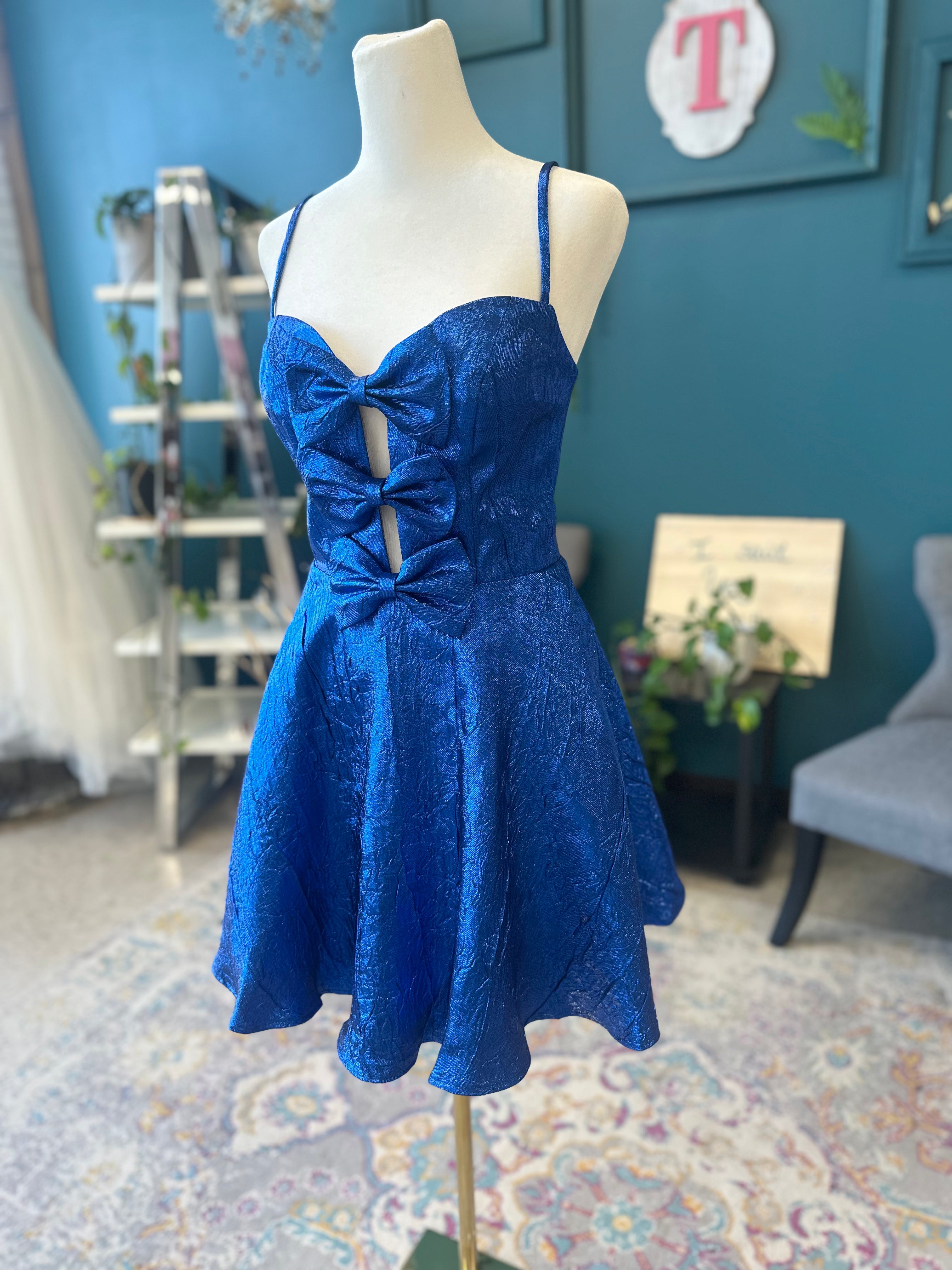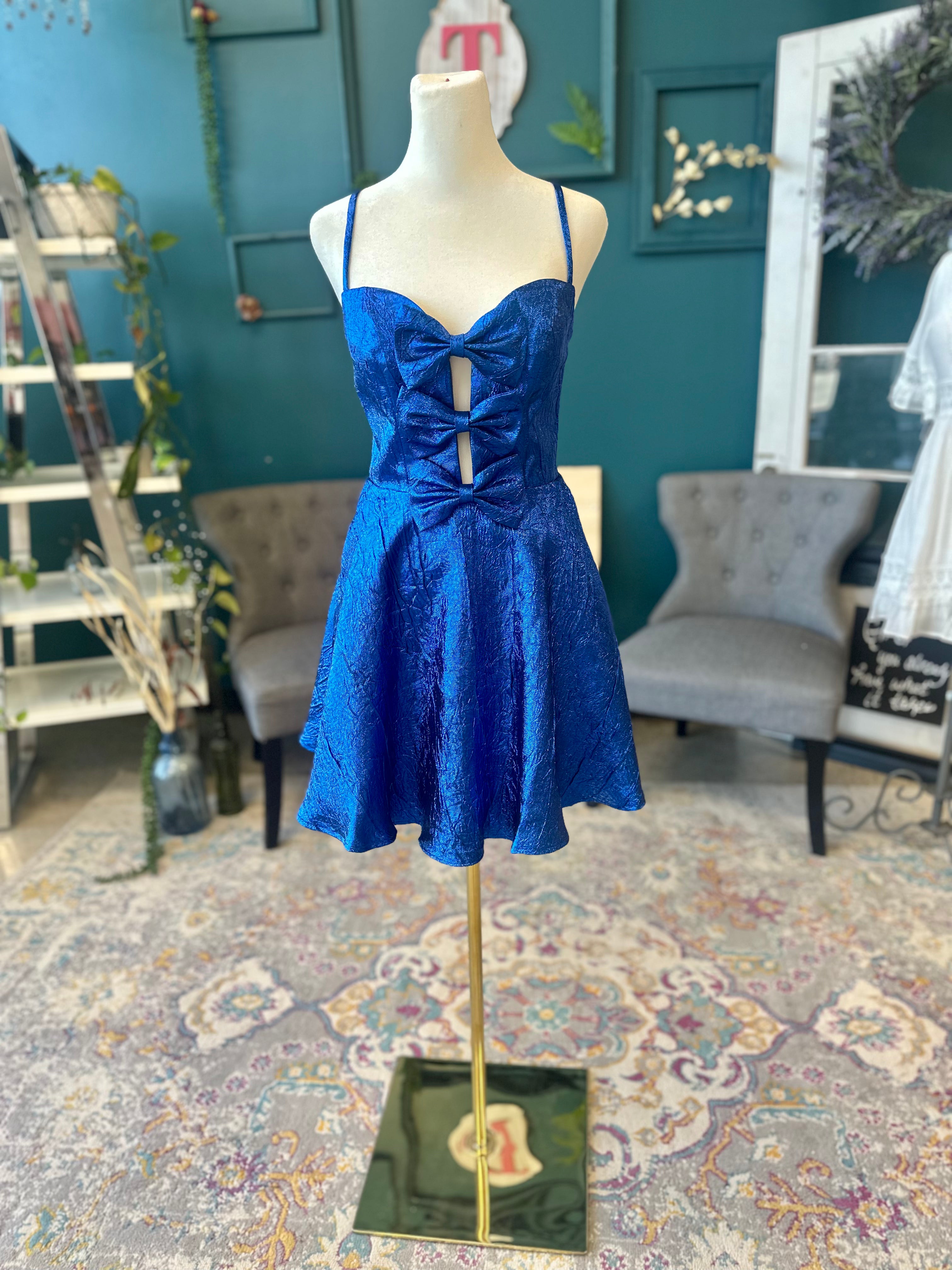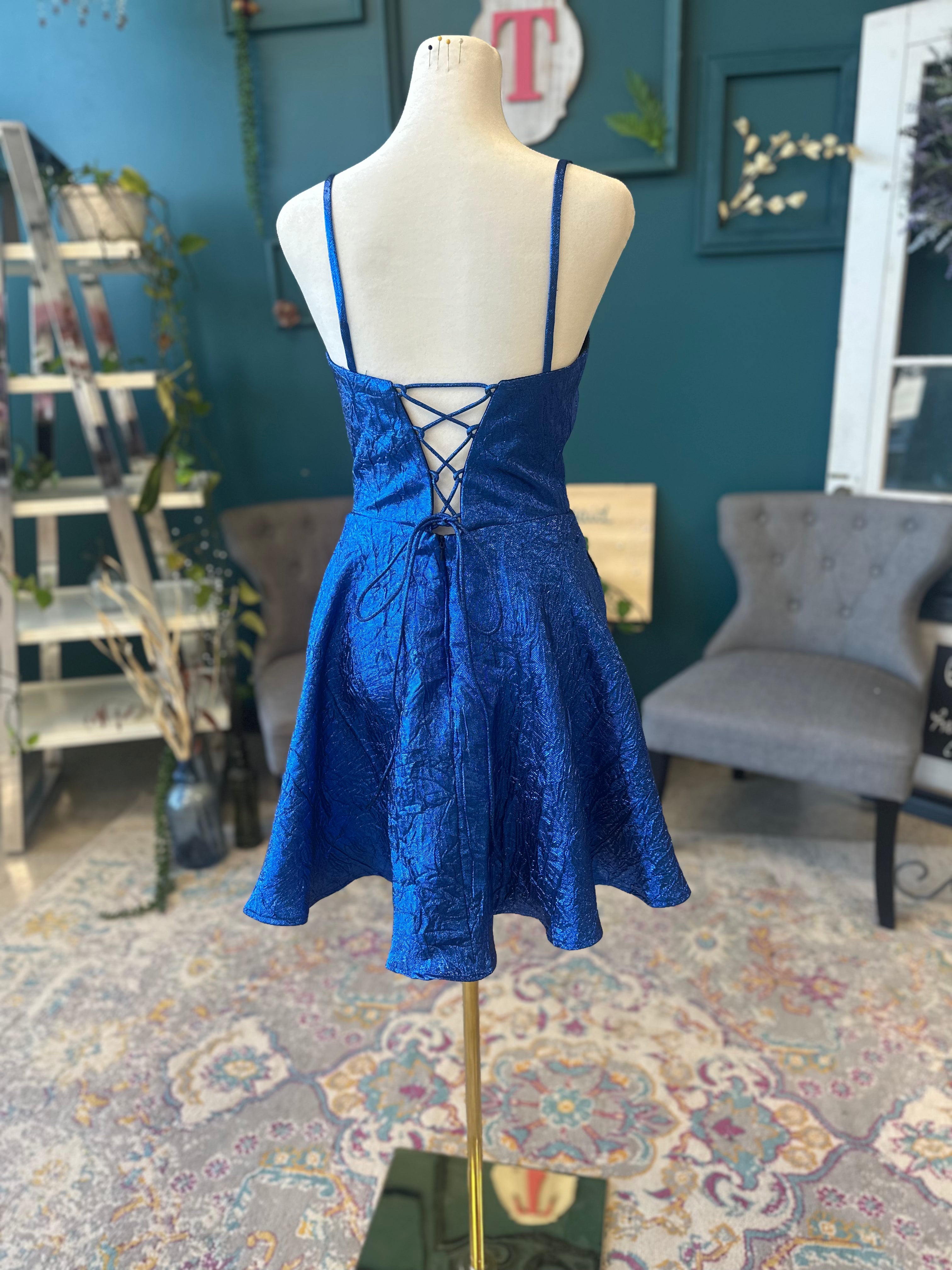Lucci Lu royal blue homecoming dress. Blue foil look without the rough texture. Skater skirt with pockets! Cute bodice with three spaced out bows and a corset back. Spaghetti straps for support.