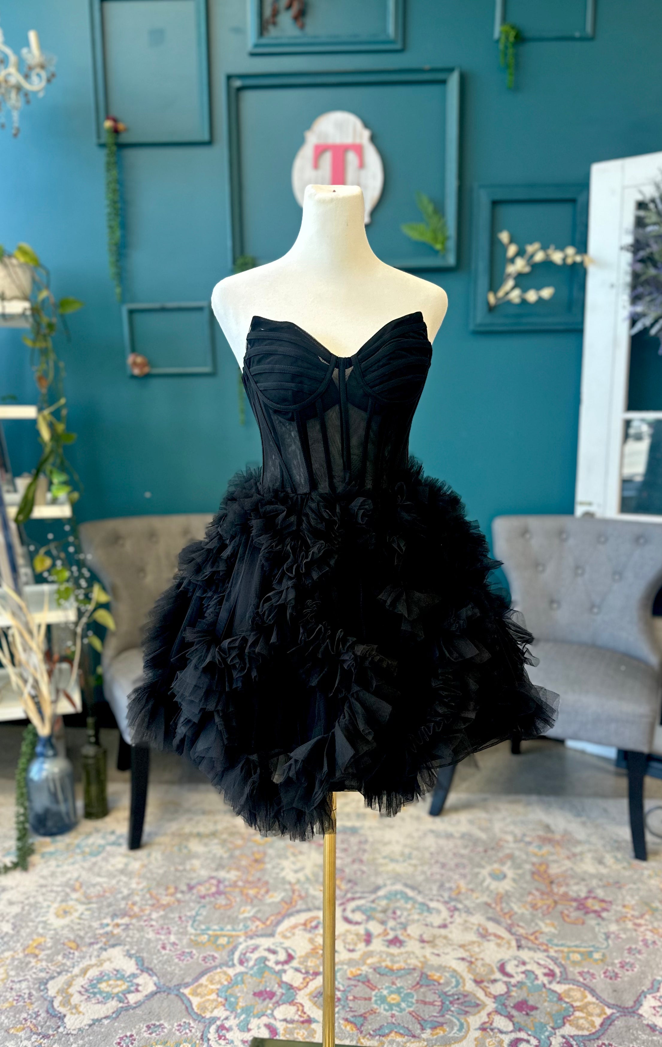 Dance the night away in this fun black homecoming gown. Textured full skirt with structured illusion bodice. You'll feel like a princess
