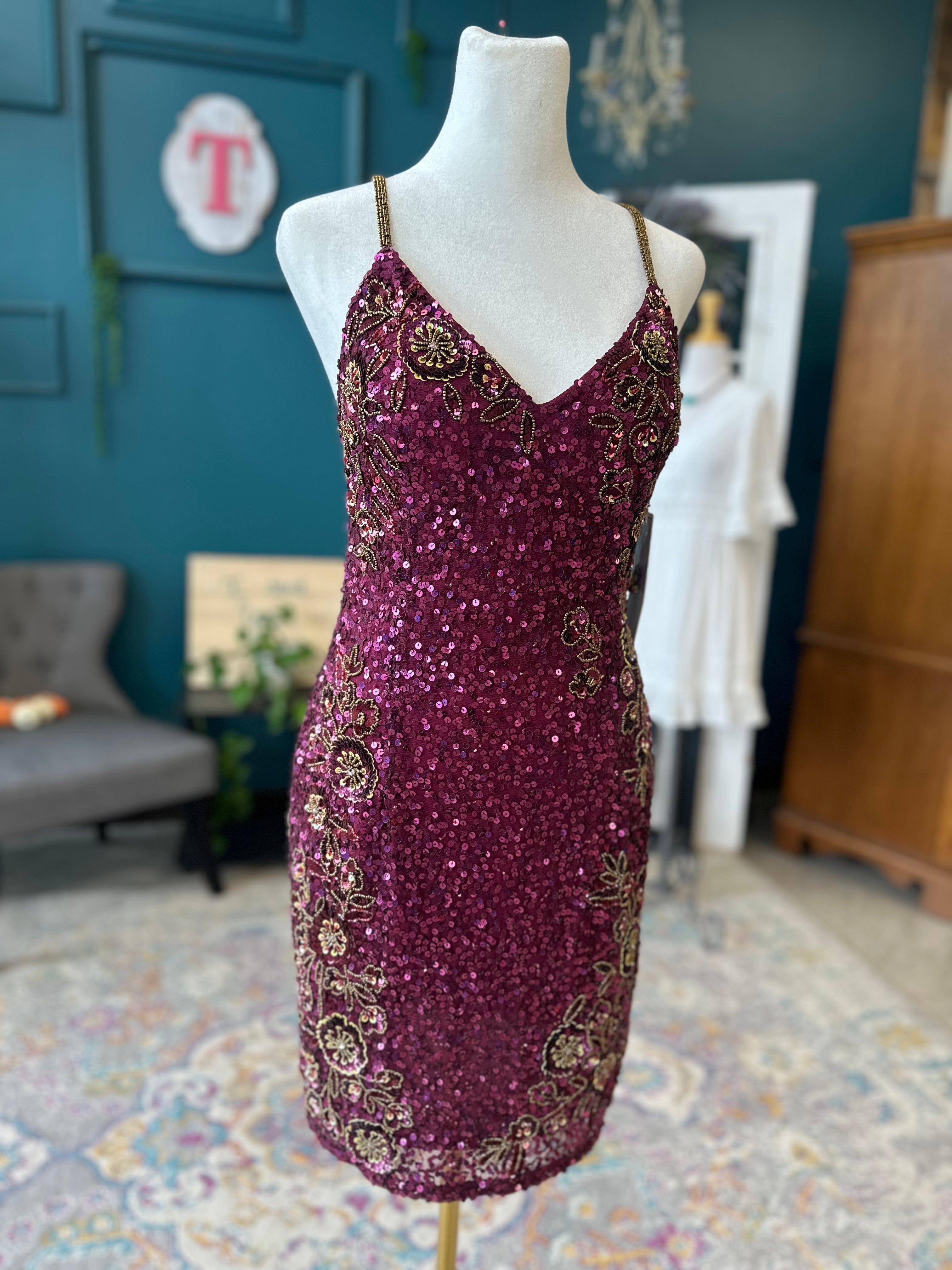 Sophia Thomas homecoming dress in sugarplum. Cute sequin and bead dress to dance the night away.